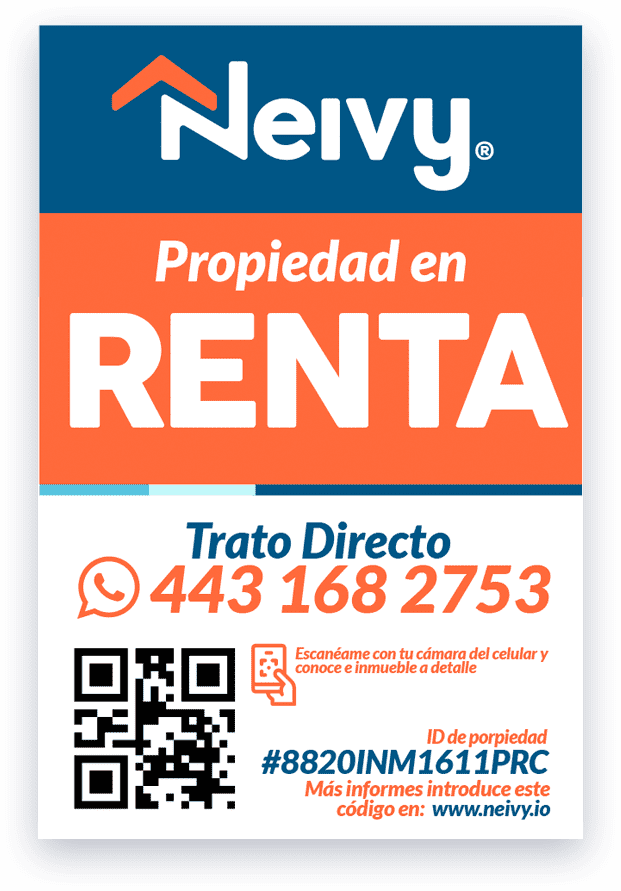 Nuestro letrero promocional incluye el código del inmueble y códigos QR para agilizar la búsqueda de quienes están interesados en encontrar una propiedad. Simplemente ingresa el código en el buscador de Neivy o escanea el código QR para acceder al anuncio del inmueble con toda la información detallada.